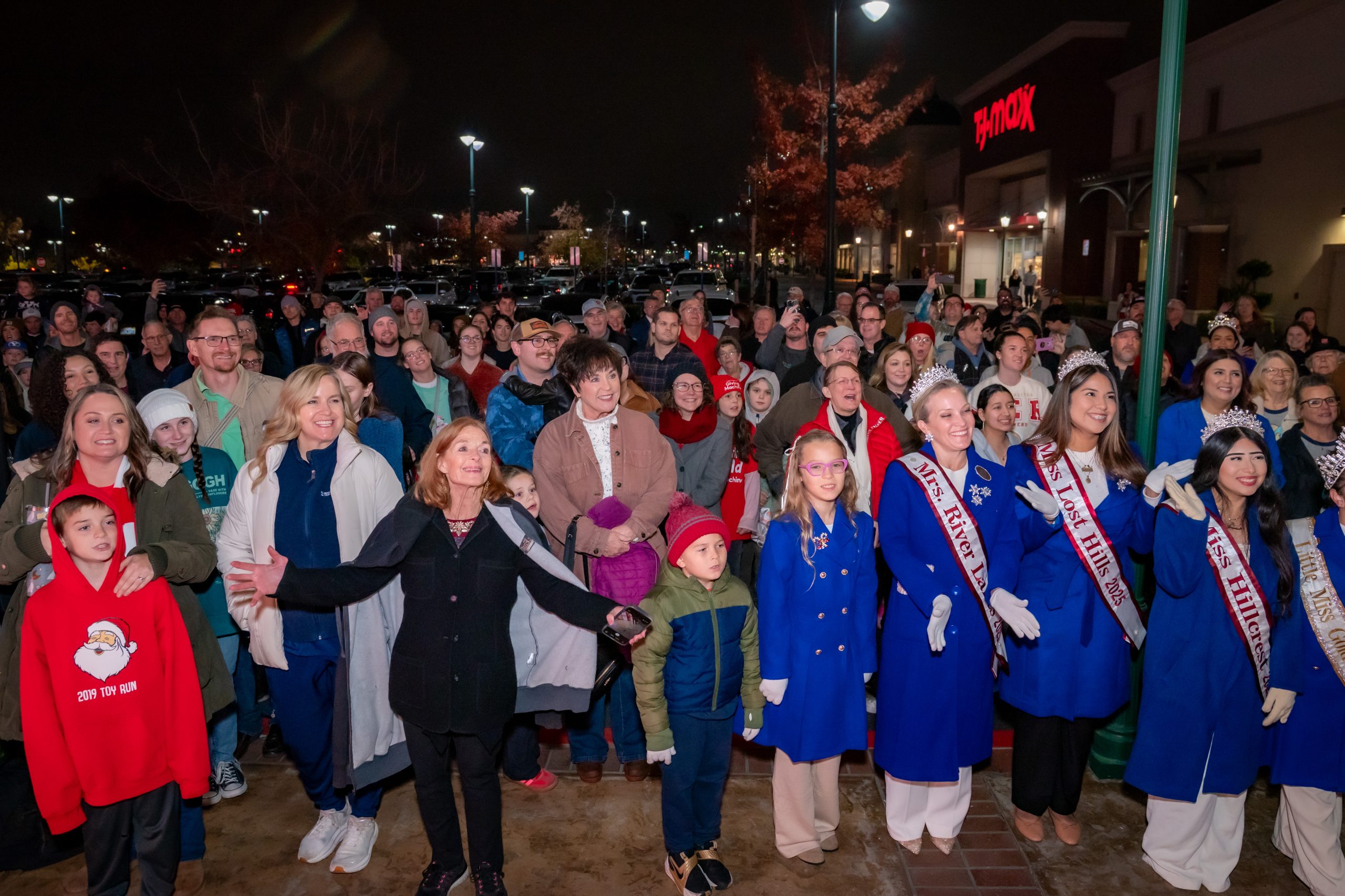 A large crowd gathers outdoors at night, some dressed in festive or winter clothes. Several women in blue coats and sashes stand at the front, smiling, with shops and holiday lights visible in the background.